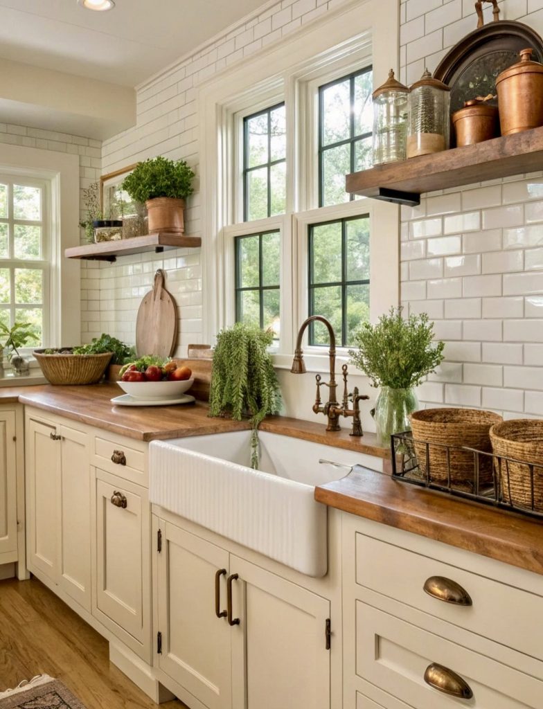 This countertop celebrates the cozy cottage trend that many American homeowners gravitate toward when they want charm without sacrificing practicality. The warm butcher-block counters make an inviting base for fresh herbs, woven baskets, and timeless cutting boards. Brass fixtures and vintage-style accents add subtle elegant touches, while greenery introduces softness against the crisp white tile. It’s an excellent example of ideas for small spaces, since every item is functional yet beautiful, creating warmth without clutter. This look works particularly well for those who cook often and appreciate the convenience of having fresh ingredients close at hand.