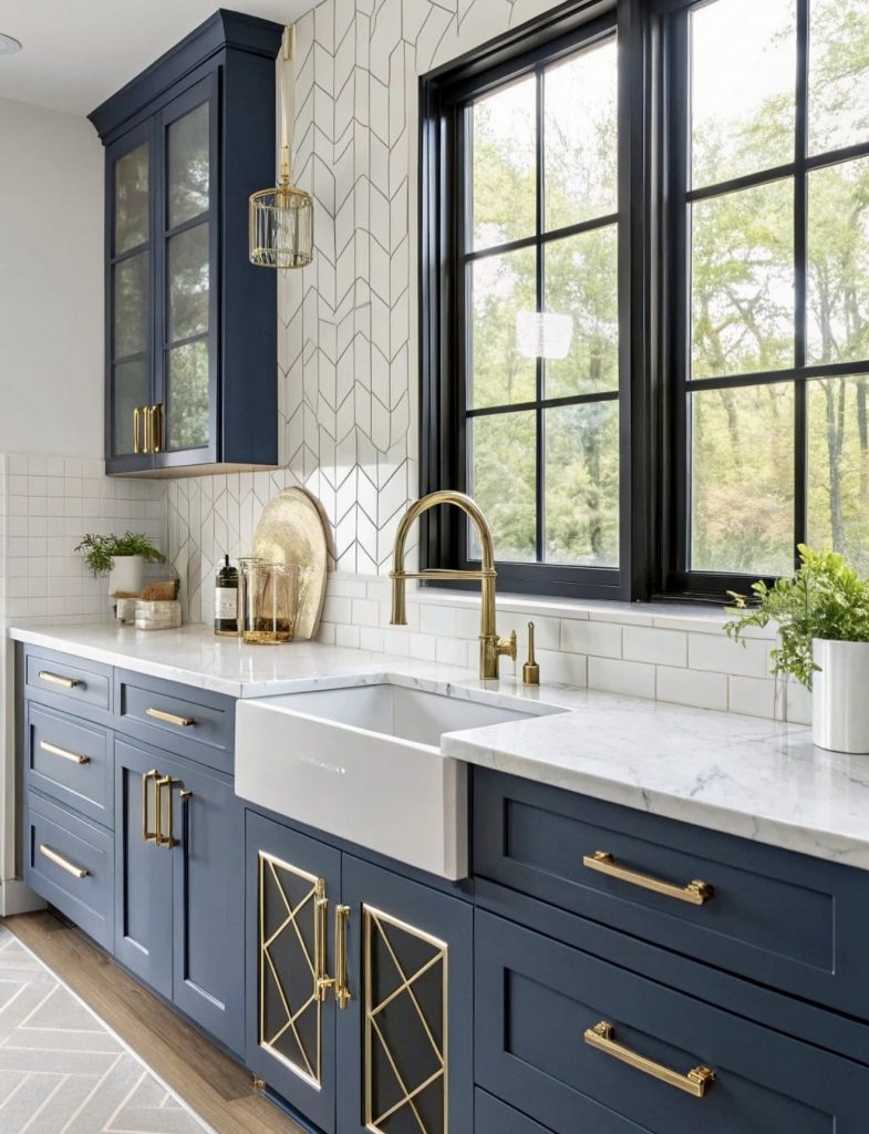 This design showcases how bold color can still feel refined, especially when paired with white marble countertops and striking brass hardware. The deep navy cabinetry adds drama, while the gold accents make the room feel polished and upscale—ideal for anyone seeking modern ideas with a little glamour. On the countertop, simple greenery, a metallic tray, and hand soap keep the space practical without stealing attention from the architectural details. The geometric pantry doors add an unexpected yet sophisticated twist, proving that even functional areas can be works of art.