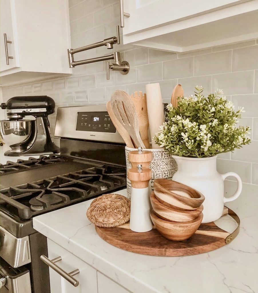 This countertop embodies the 2026 movement toward minimalist ideas, using a round wooden tray to corral everyday pieces like the utensil holder, salt and pepper grinders, and stacked bowls. It’s a great example of styling that feels intentional without being fussy. A small greenery arrangement adds life and complements both white and grey cabinetry—an approach many designers call “effortlessly elegant” because it softens the industrial feel of metal appliances. This type of setup works beautifully for homeowners who want a clean, modern corner moment without sacrificing warmth.
