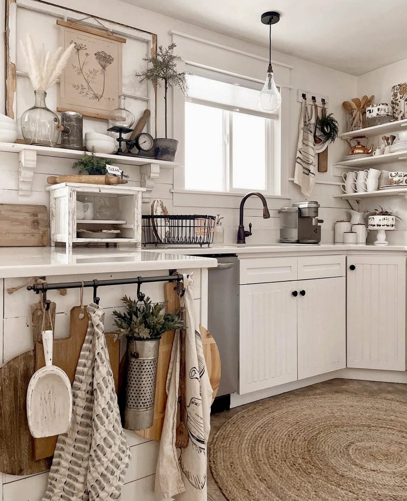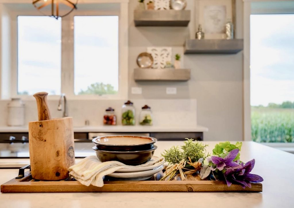 This kitchen blends rustic charm with modern practicality, and the countertop décor follows the same cozy rhythm. The white island surface stays intentionally clean, broken only by a simple wood board and a neutral bowl that reinforces the soft, earthy palette. Near the cooktop, cutting boards, pottery, and a touch of greenery create a warm focal point that feels inviting without overwhelming the space. Pampas grass in a tall vase brings height and softness—an effortless way to dress up an island while keeping the look rooted in modern farmhouse aesthetics. The overall balance makes this kitchen feel like a comfortable gathering place, especially for families who love hosting.