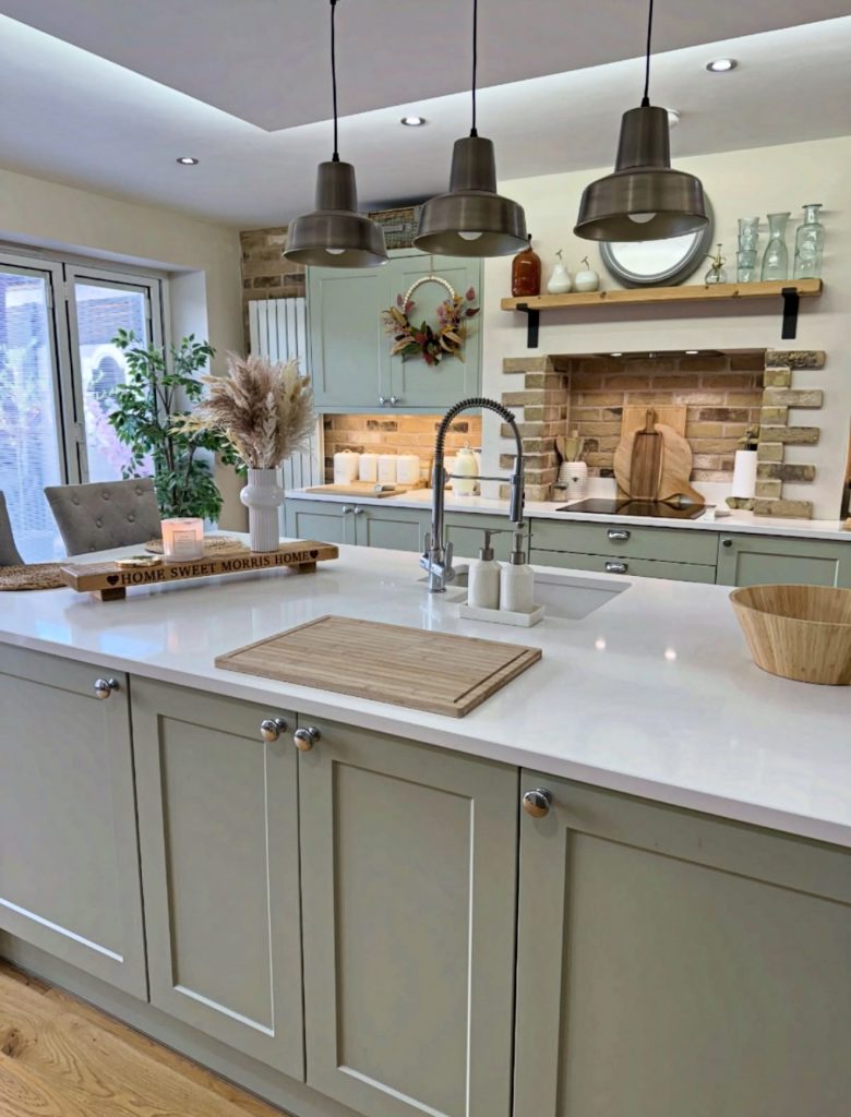 21. Brick Accents and Soft Green Cabinetry With Warm, Homey Counter Styling