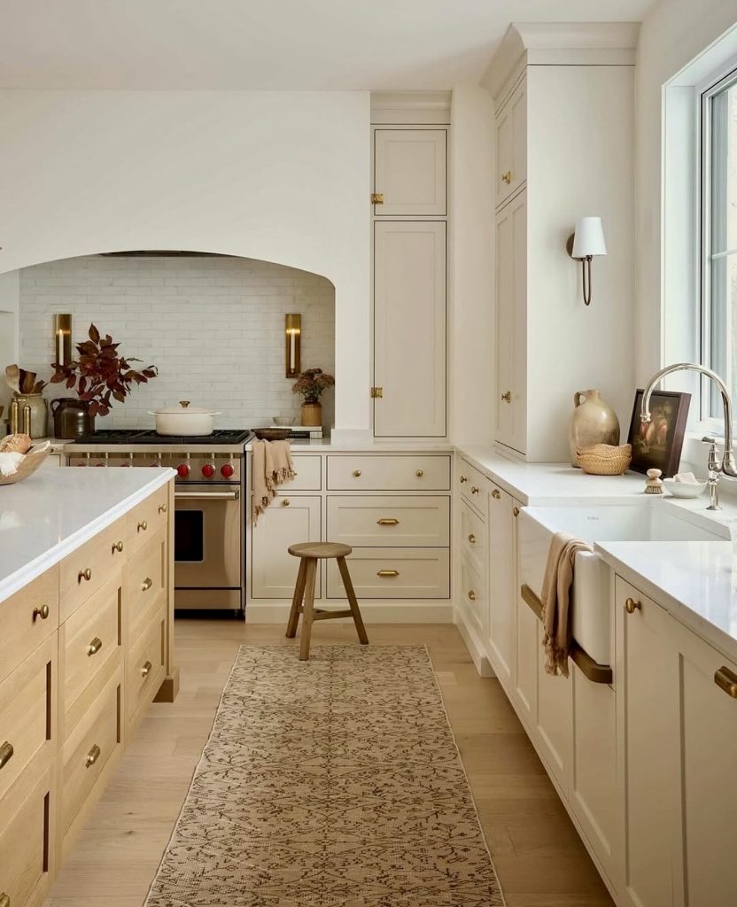 This kitchen beautifully demonstrates how elegant a neutral palette can be when paired with thoughtful countertop styling. The long white marble counters stay mostly clear, allowing sculptural ceramics, a small stack of everyday dishes, and dried foliage to bring subtle character. The soft brass touches—cabinet pulls, sconces, and faucet—add warmth without overpowering the room. This space is a masterclass in minimalist ideas, favoring quality over quantity and creating an atmosphere that feels quietly luxurious. It’s the kind of kitchen where everything has a place, and the counters reflect a life that values calm routines and intentional design.