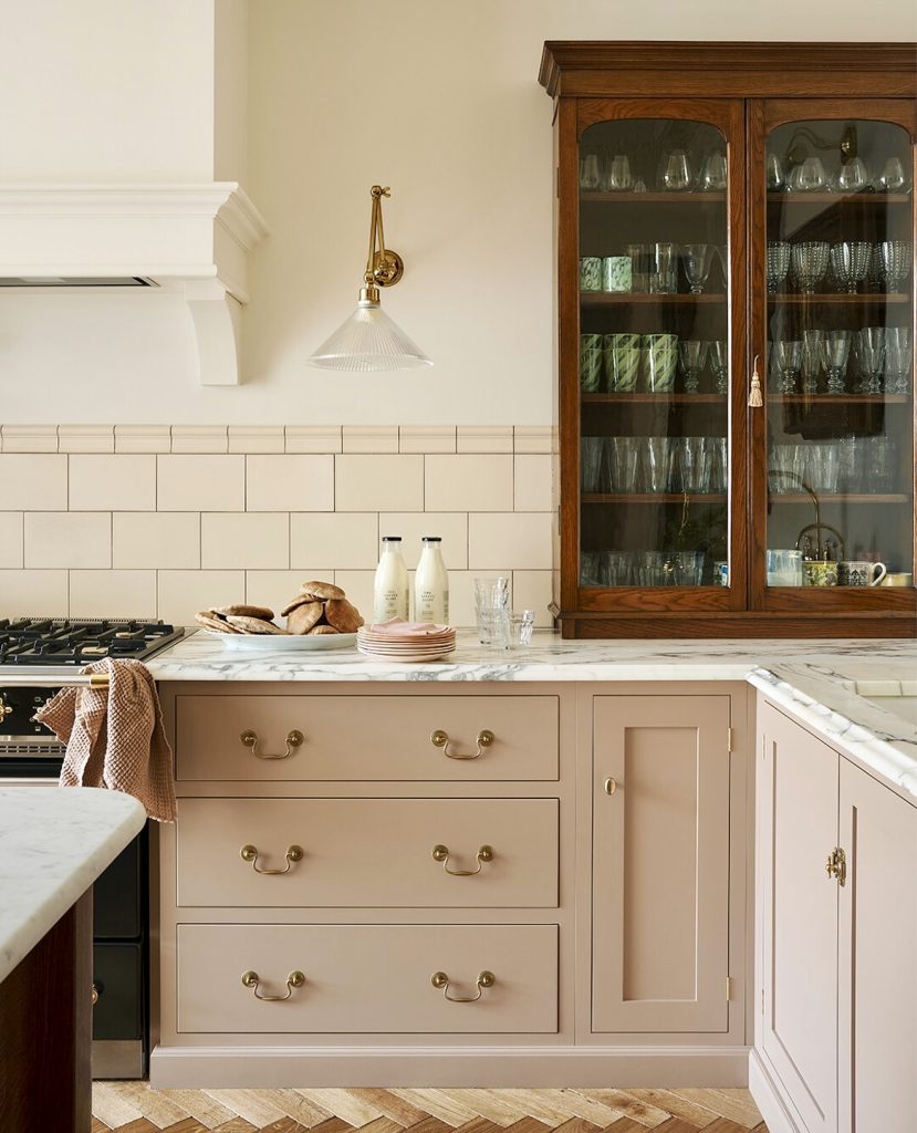 23. Old-World Charm With Marble and Soft Pink Cabinetry