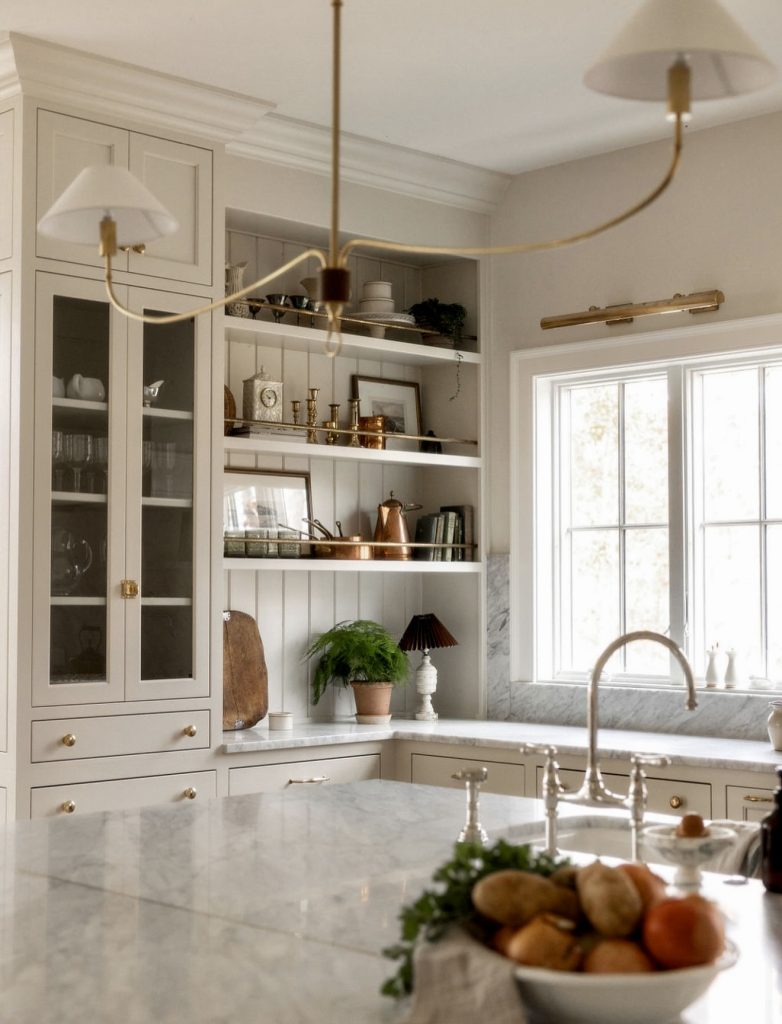 This countertop styling leans into the “collected over time” look that designers like Shea McGee and Jean Stoffer have made mainstream. The veined white marble counters are kept light and simple, while the shelving behind them showcases antique copper and brass candlesticks and textured ceramics. A leafy fern adds a pop of green that keeps the palette from feeling too monochrome. Because the counters themselves stay minimal—with just a bowl of produce and hand soap—the space feels clean yet warm. It’s a perfect example of elegant décor that still honors everyday function.