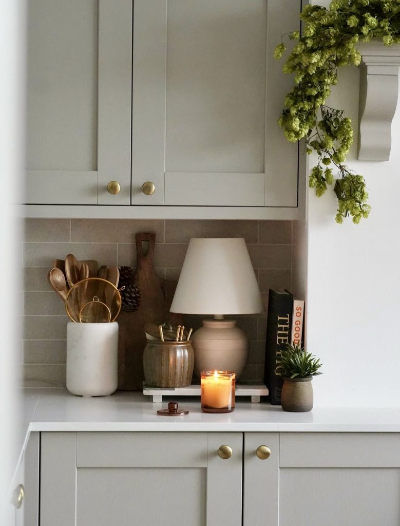 This corner shows how to transform the smallest areas into an inviting space. The softness of the grey cabinetry complements the taupe tile, while the countertop vignette warms the area with wood utensils, a ceramic pot, and a candle. The small lamp and cozy countertop, which will be a hit for 2026, provide ambient light for early morning and late-night tea with the candle. A light extra decor of greenery and a few favorite cookbooks offer personality without clutter. This setup is ideal for small spaces, proving that even modest corners can feel stylish, comforting, and lived-in.