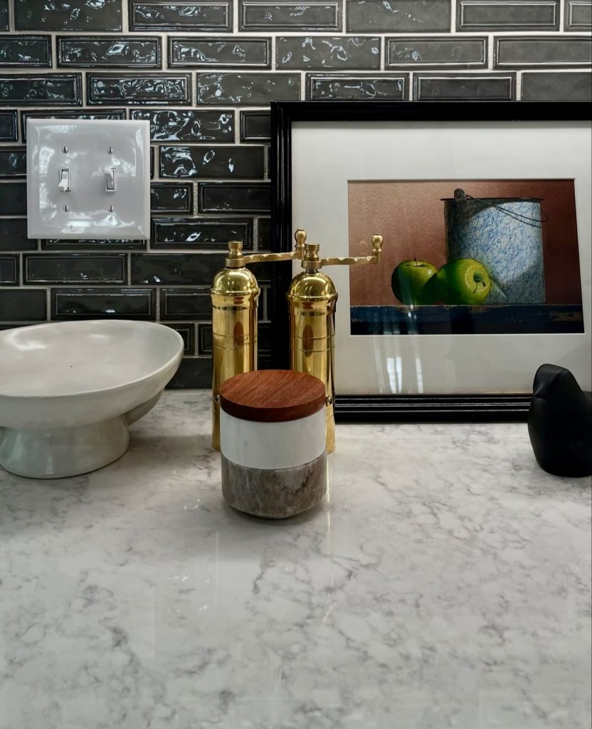 This countertop shows how powerful contrast can be when styling a smaller area. The high-gloss dark tile backsplash instantly adds depth, making the brass pepper mills gleam like sculptural pieces. Pairing them with a framed still-life print gives the space a collected, gallery-inspired feel—something design tastemakers say is becoming more common in modern kitchen ideas. The smooth ceramic pedestal bowl balances out the strong textures, while the marble-patterned surface keeps the styling grounded. This compact setup feels curated and confident, proving that even tiny corners can hold big personality.