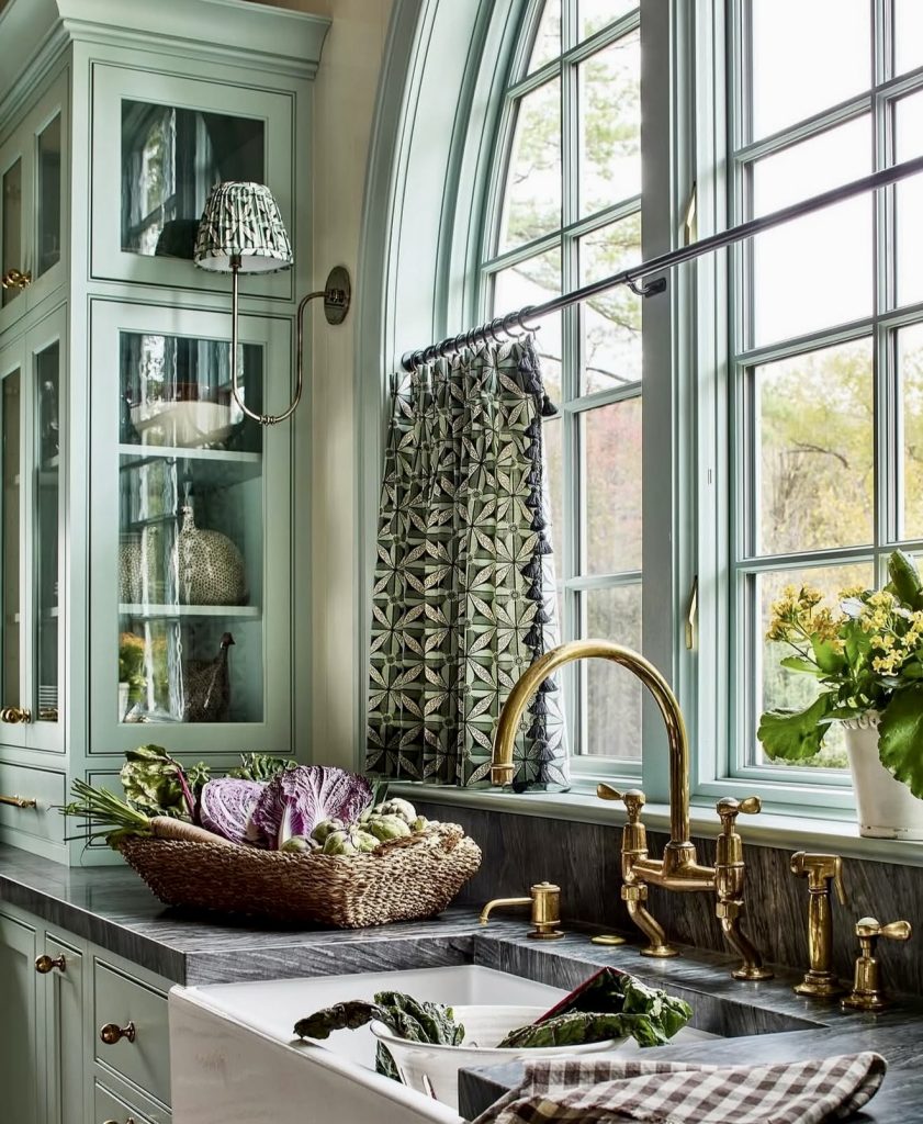 This kitchen celebrates the elegance of green cabinetry paired with rich brass hardware, creating a look that feels both timeless and fresh. The countertop styling is subtle but impactful: a woven bowl filled with vibrant vegetables introduces earthiness, while the veined stone counter keeps everything feeling upscale. The arched window framing the sink brings in abundant natural light, making the brass glow even more. This design aligns beautifully with elegant ideas and modern trends that highlight craftsmanship, classic colors, and a connection to nature.
