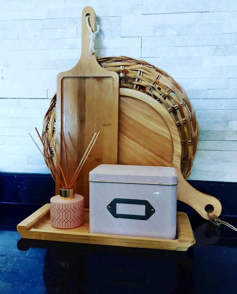This vignette embraces warm neutrals and natural textures, featuring layered cutting boards, a wooden tray, and a soft blush storage box that adds a hint of feminine charm. The reed diffuser introduces scent and sophistication, making the corner feel complete without clutter. It’s a gentle example of minimalist décor—nothing unnecessary, yet everything thoughtfully placed. This style works exceptionally well in homes that appreciate a calm, sensory experience in the kitchen, balancing function with beauty.