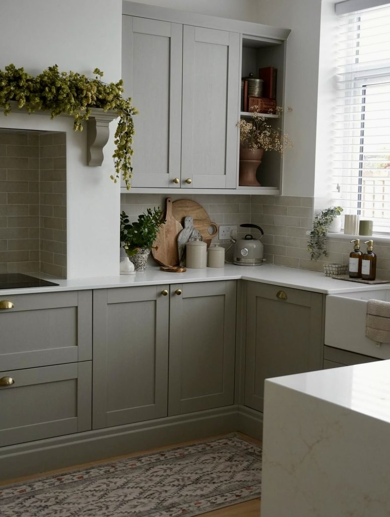 Here, calm grey cabinetry and muted backsplash tile create an inviting base, letting the decorative accents feel curated rather than crowded. Wooden cutting boards, vintage-style jars, and subtle greenery bring in texture—a classic technique praised by interior experts like Studio McGee for adding dimension to neutral kitchens. This design shows how to decorate a corner without overwhelming it: keep the palette tight, the materials natural, and the objects meaningful. The result is an elegant countertop look that feels timeless.