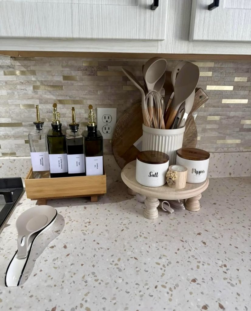 This layout leans into practical beauty—four labeled oil bottles neatly arranged in a bamboo stand make everyday cooking feel elevated. Placing them alongside a ribbed utensil holder and small spice jars keeps the area functional while still stylish. Light stone counters with flecks of warm tones echo current granite-inspired trends, which homeowners love for their ability to hide minor messes while still looking polished. This setup is ideal for people who cook often and want beauty and efficiency in one compact arrangement.