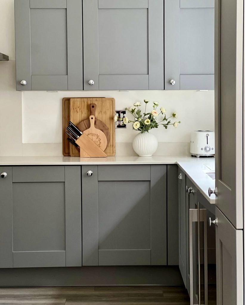 The design is all about clean lines and calming hues Smooth countertops paired with shaker-style grey cabinets create a backdrop that feels modern and grounded. The stacked wooden cutting boards offer a natural contrast, while the simple white vase of flowers adds a fresh, elegant touch without overwhelming the space. This look is perfect for anyone who prefers understated décor and wants a countertop that feels open, airy, and ready for both busy mornings and relaxed weekends. [ID16]