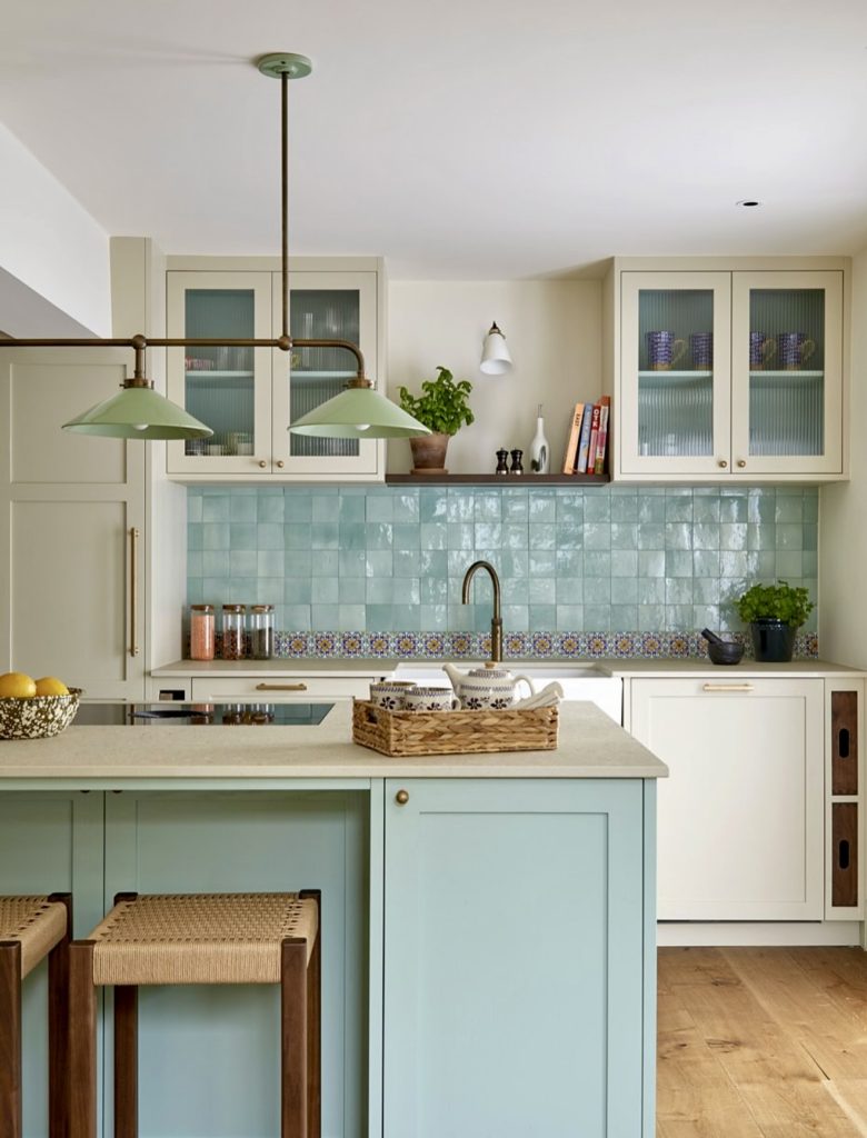 This kitchen embraces color in a way that feels both nostalgic and modern, weaving soft mint cabinetry with a beautifully glazed tile backsplash. The countertop décor is intentionally subtle—a woven tray with teapots and ceramics keeps the surface tidy while complementing the handcrafted textures in the room. This setup is perfect for anyone who loves Indian ideas or modern touches that feel curated rather than trendy. The blend of soft hues, brass hardware, and open shelving makes the entire space feel warm and approachable, especially in small spaces where every piece needs to serve a purpose.