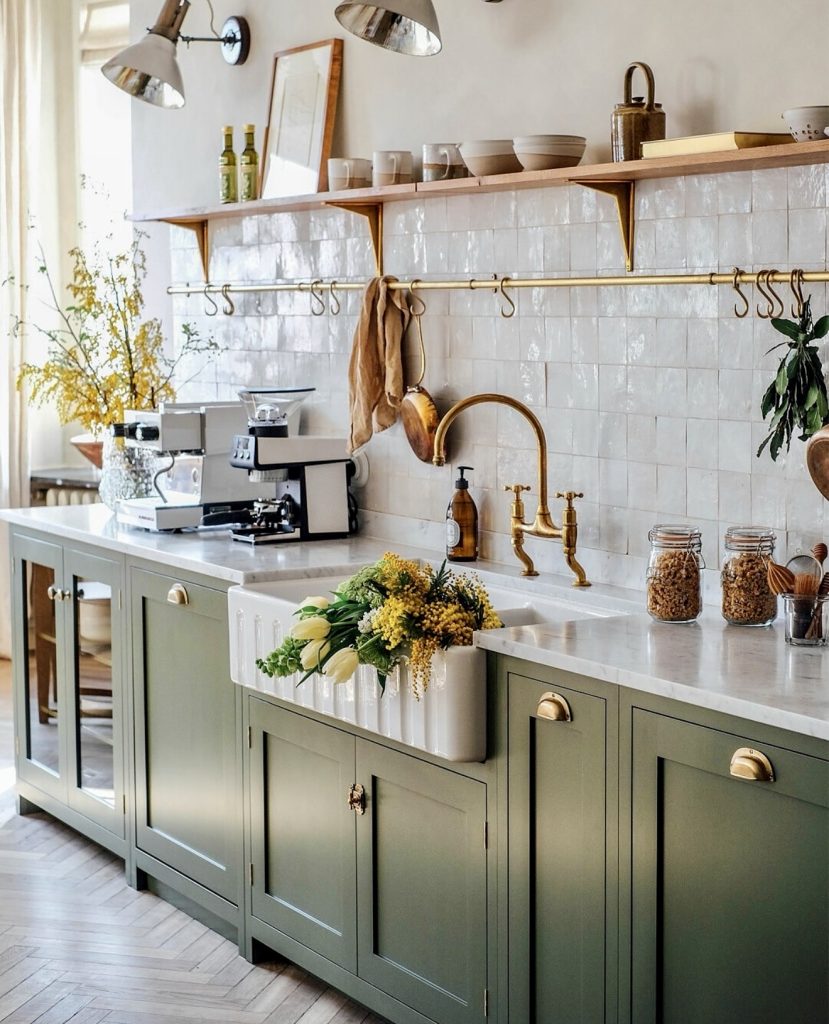 This design channels a charming European farmhouse aesthetic, pairing deep green cabinetry with glowing brass fixtures and glossy tile. The countertops themselves are styled with simple glass jars, fresh florals, and a coffee station—an everyday luxury that many homeowners now consider essential. The look is both elegant and relaxed, demonstrating how to decorate long stretches of counter without clutter. Even the placement of herbs and oils feels thoughtful, tying into the growing interest in island ideas and extended prep spaces where beauty and utility coexist naturally.