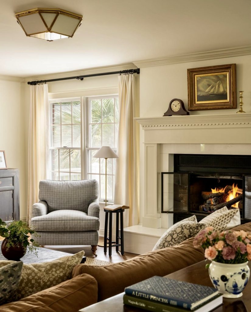 Here, rustic charm prevails with a classic room with a roaring fireplace, spreading coziness with a seating area. With a brown sofa that contrasts with a delicate cream curtain, it provides a color palette that mingles earth-tone coziness with classic charm. Flowers with patterned pillows inject a subtle level of boho as well as classic charm into the room. The farmhouse-style idea comes through but with a modern farmhouse-style twist that feels fresh instead of retro. This is a room where a Christmas wreath or candles would work beautifully to add seasonal character but not compromise its innate beauty.