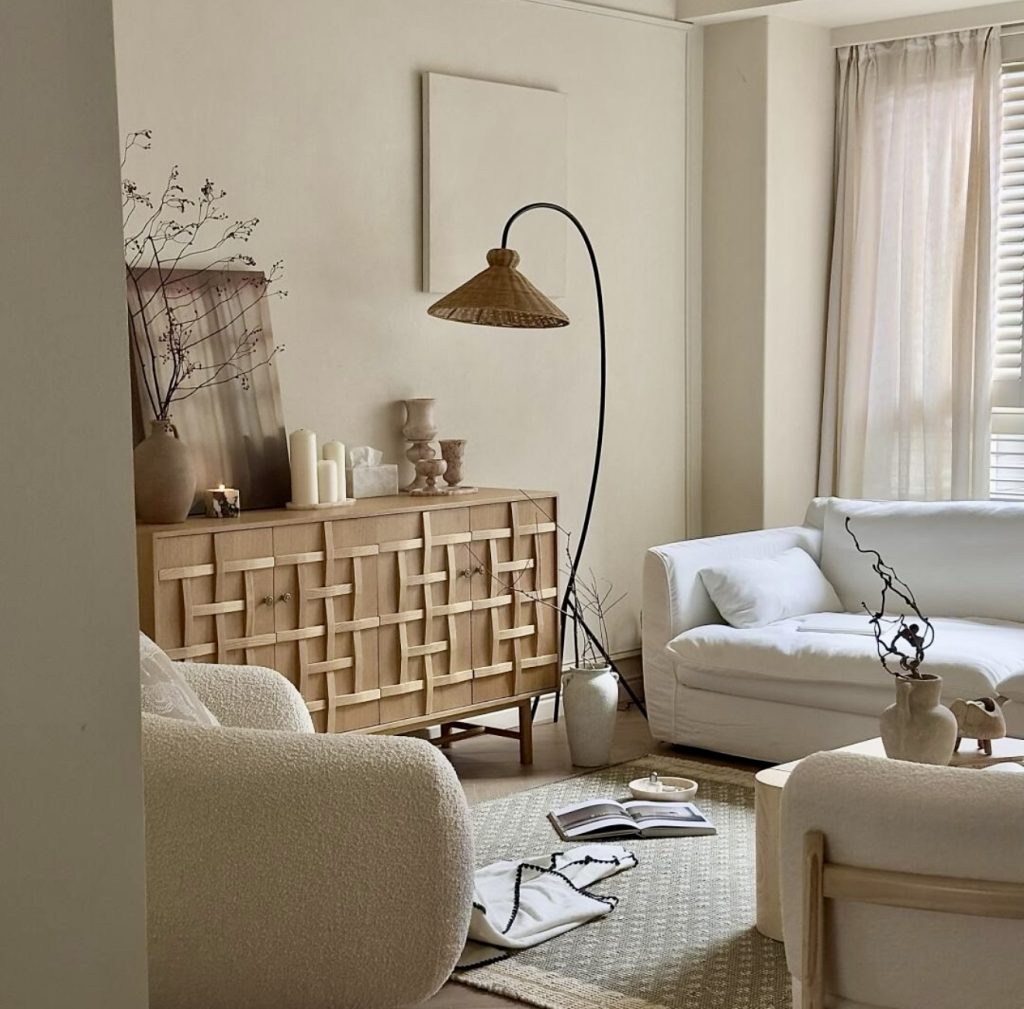This room embodies rustic modern minimalist style with its minimalist silhouette, woven elements, and natural wood cabinet. The boucle chair and white sofa provide a neutral texture that invites relaxation with their coziness. A sculptural light and select ceramics contribute a classy, sleek detail that gives a boost to the overall look. Its uncluttered layout emits a calm Zen ambiance that feels timelessly fresh. It’s a look that works for both small rooms and apartments, as it proves that less really can be more.
