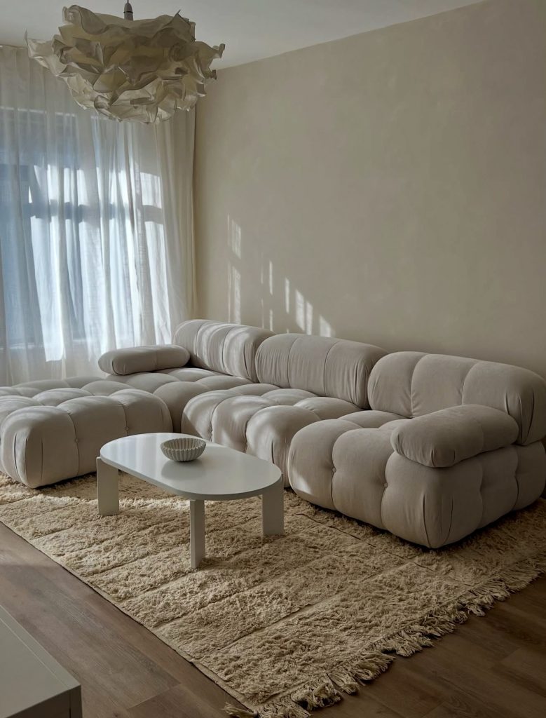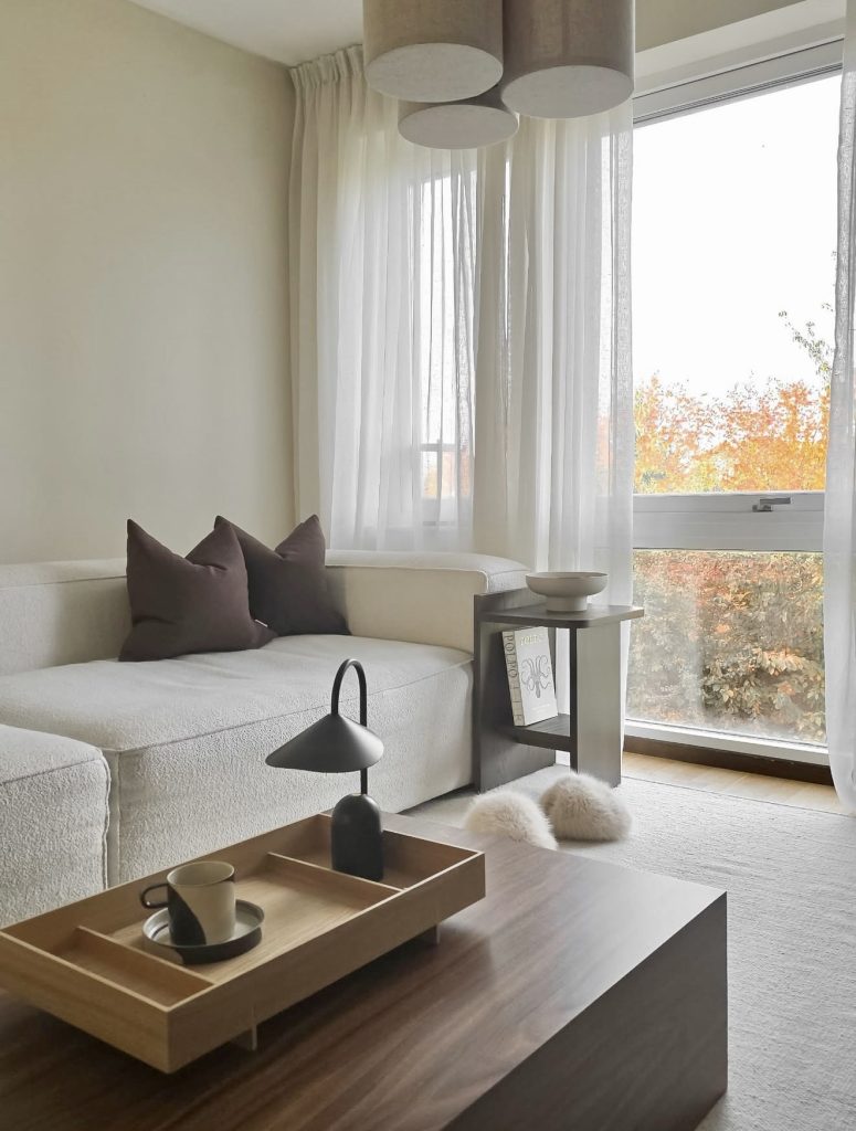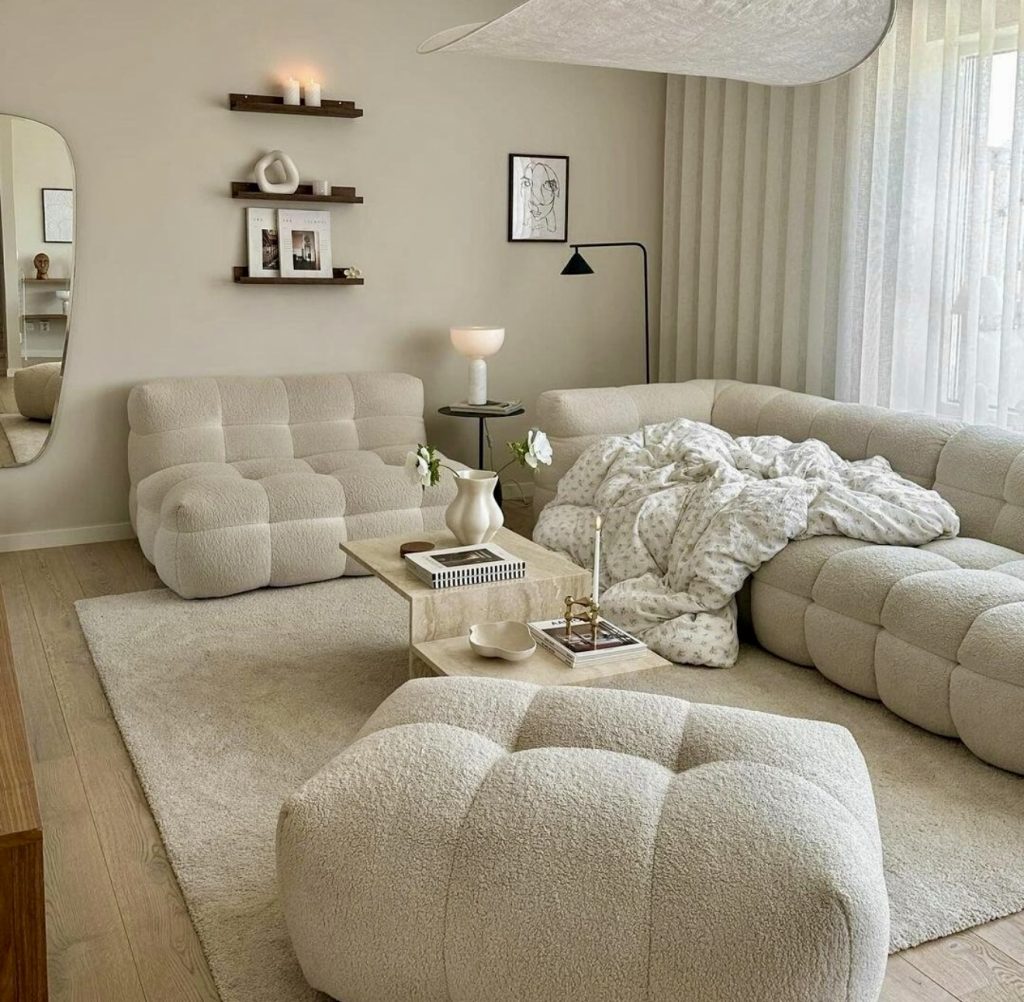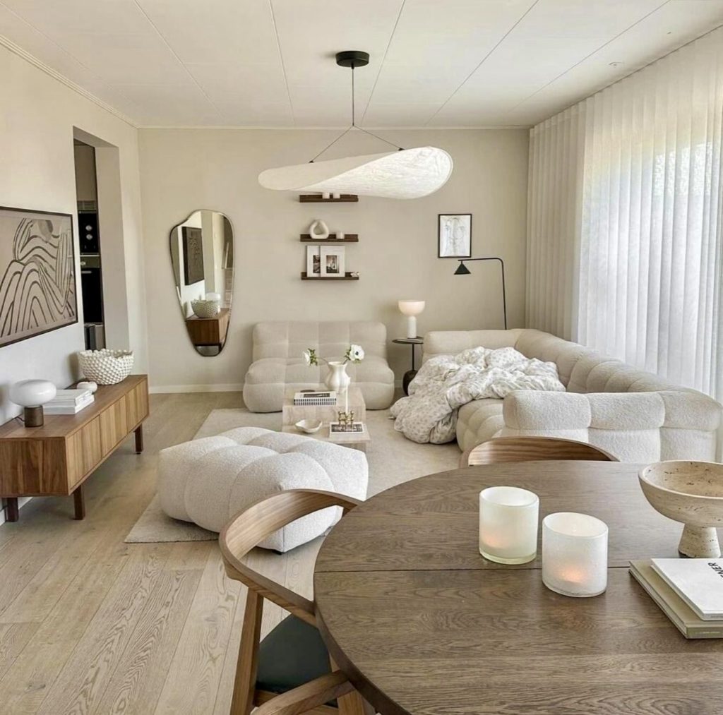 This living room adopts a calming neutral color scheme, with a large sectional and boucle armchair, as well as dark wood coffee tables bringing earthy balance. Candlelight warms up the mood, demonstrating that coziness need not at all mean clutter or excess. An oversized plant adds a natural focal point, fusing Zen calmness with contemporary sophistication. Softer materials, such as the throw as well as pillows, create sensory comfort ideal for chilled-out evenings. It’s a marvelous example of rustic modern minimalist style that lends itself perfectly to apartments or compact areas.