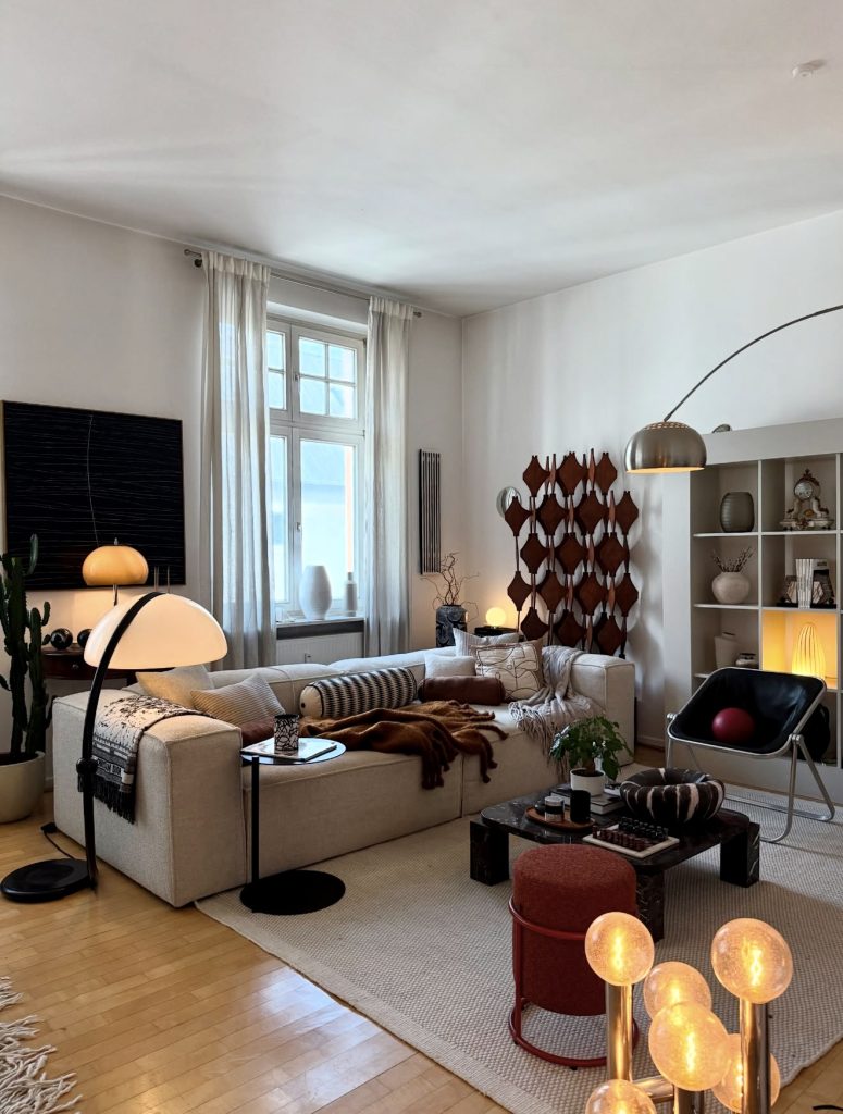 The living room abides by a midcentury modern aesthetic with lamps, graphic forms, and statement wall paintings. A combination of earth-tone hues along with layered textiles lends a vintage ambiance that feels collected personally. A neutrally upholstered sofa anchors it, with accents in dark wood and rust that create a black and brown cohesion. The playfulness of lamps as well as sculptural pieces lends a pop of color that sets it apart visually. It’s a cozy setup that works for both large living rooms and fashionable apartments.