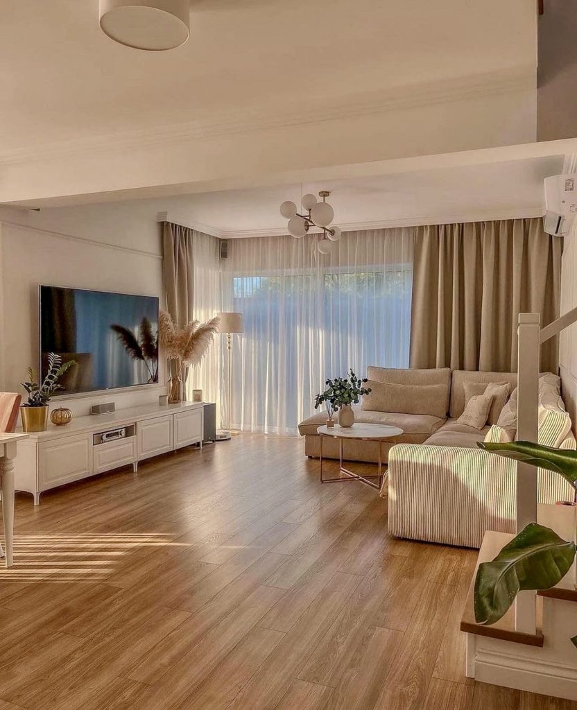 The living room implements modern farmhouse style with an L-shaped sofa and a canopy of curtains, as well as sunshine that comes from large casements. Its wooden floor as well as pampas grass decor add earth-tone coziness, which anchors its neutral color palette. The uncomplicated coffee table and subdued textiles produce a warm ambiance that exudes a country yet sophisticated look. It’s a flexible design that suits large family homes or couples in flat living situations that demand peacefulness as well as coziness. Throw in a seasonal Christmas garland or candle arrangement, and this room instantly lends itself to the holiday seasons.