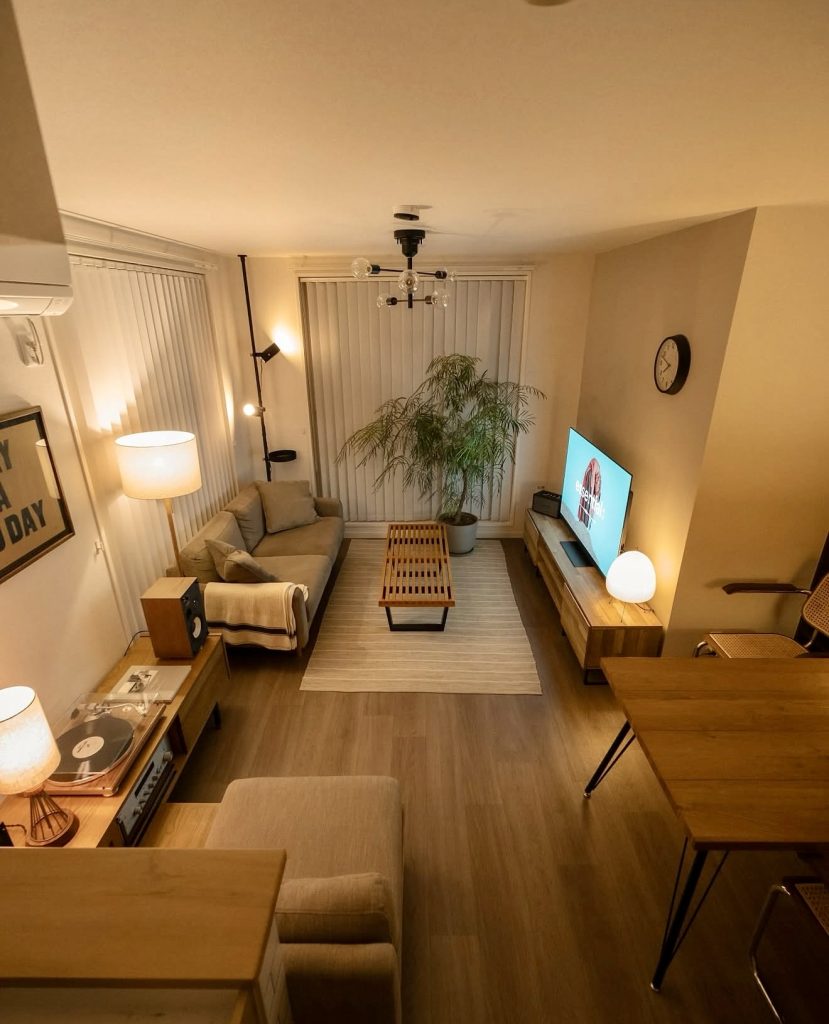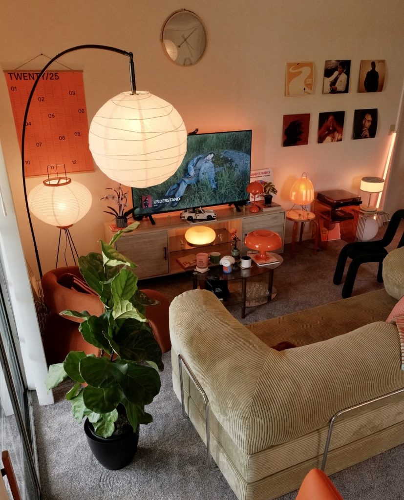 This living room exudes a lively spirit with a mix of colorful retro elements as well as free-spirited boho charm. The green corduroy sofa as well as orange lighting add a fun yet inviting ambiance, demonstrating that bold design need not lack heart or homeliness. A combination of wall decorations, lamps, and free-spirited accessories infuses a retro look, ideal for individuals who appreciate distinctiveness. Despite the free-spirited collection, room layout remains utilitarian as well as welcoming for a day-to-day living style. It’s an original inspiration for flat living arrangements where coziness need not translate to dullness or unoriginality.