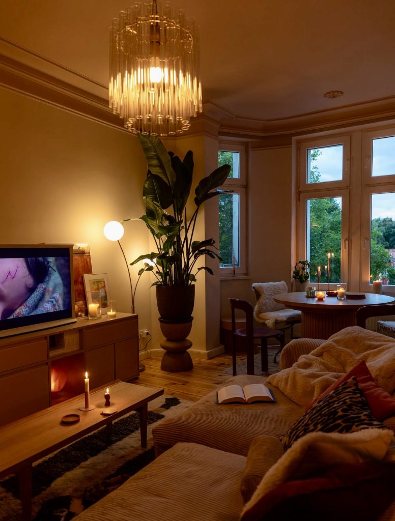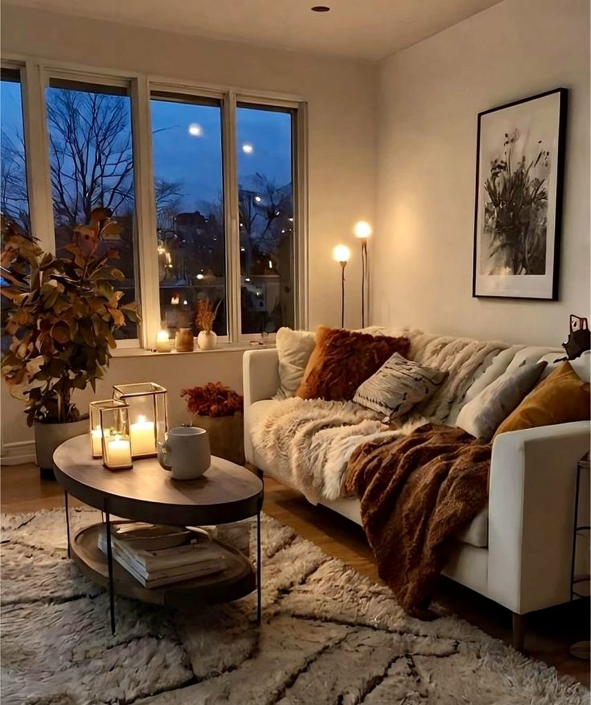This composition recreates a winter evening’s magic in a rustic modern minimalist living room. A warm earth-tone palette of caramel and beige drapes a sofa, topped with faux-fur throws and texturally varied pillows. Candlelight flickers across a round coffee table, reminiscent of simple Christmas coziness but sans overt holiday decorations. Its cozy glow, coupled with its large window framing, recommends it for small rooms or an apartment’s girly look—intimate yet sophisticated. Its ambiance exudes sophisticated, classy charm with a priority on coziness.
