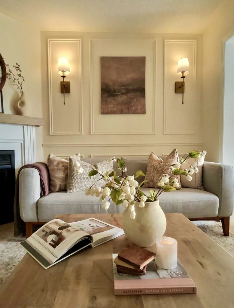 Here, neutral hues converge with vintage earth-tone elements in a sophisticated, elegant, classy living room. The paneled wall as well as sconces create architectural charm, while a light grey sofa injects softness. A texturally varied rug, as well as minimalist accessories, such as a stone vase and a few books, creates a classy ambiance sans sensory overload. Best suited for fans of farmhouse-style modern living room design, this room exudes a feeling of being carefully curated yet somehow accessible—like homes seen on Better Homes & Gardens. It serves as a demonstration that low-key décor may substantially be inviting at its core.