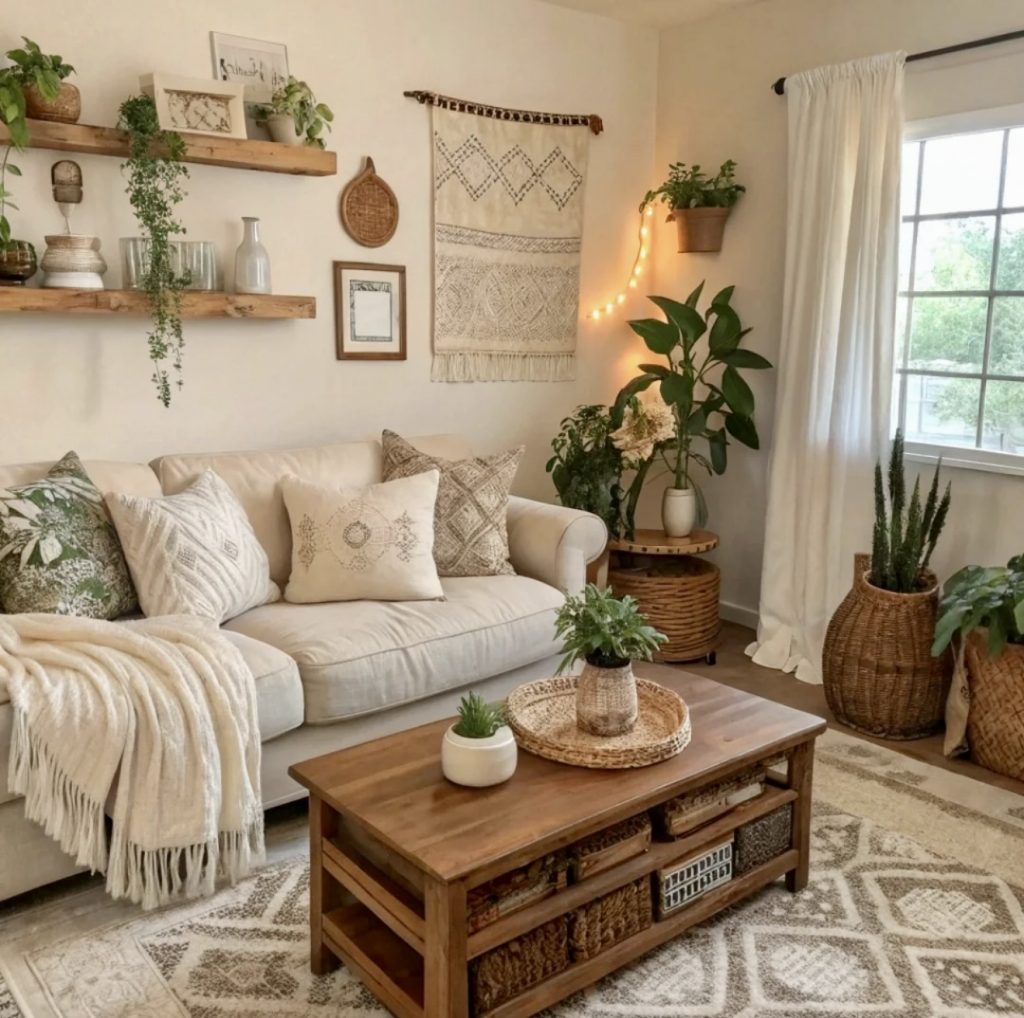 For a home that hungers for coziness as well as depth, this boho-inspired farmhouse-style living room offers a sensory experience. Textured baskets and texturally varied throws, as well as indoor plants, conjure rustic peacefulness, while soft beige materials emphasize modern simplicity. Its raw materials as well as layered neutrals produce an earthiest mood, best suited for compact rooms or rental apartments requiring a personality boost. With a few greenery elements and black and brown wood accents, it feels both retro and now—just right for everyone who longs for a peaceful corner for reading or unwinding.
