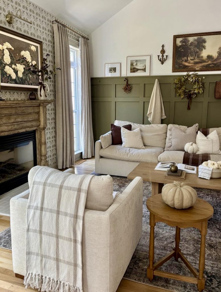 This intimate arrangement mingles farmhouse-style modern charm with classic texture. Its olive-green wall panels anchor a beautiful contrast with the neutral sofa and soft plaid throws. Vintage paintings and a stone mantel add a sophisticated, classy flair, with natural pumpkin and ambient lighting hinting at simple Christmas coziness. This look feels at once rustic yet refined—just right for a family apartment or suburban home that emphasizes coziness with nostalgic charm alongside a modern fresh face.