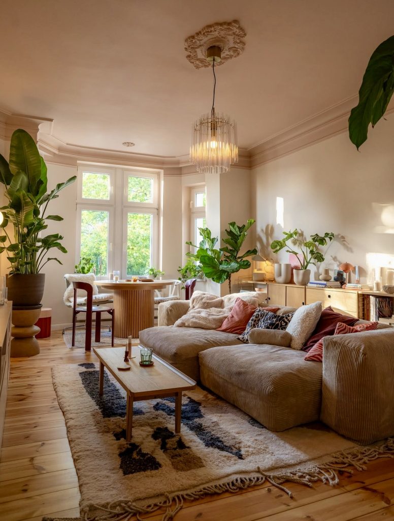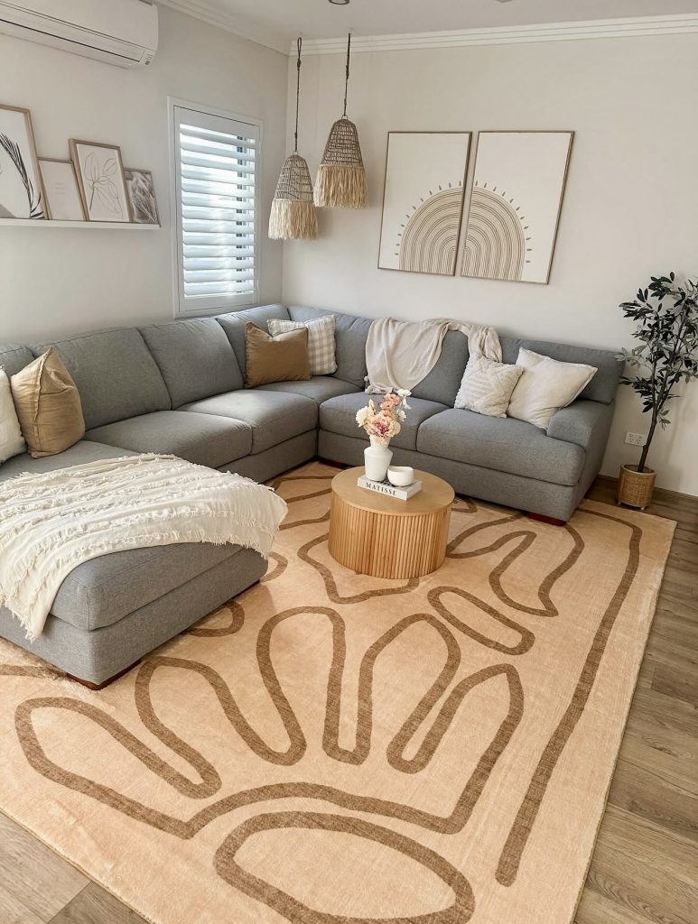 A combination of modern lines with a boho-softness defines this warm apartment. Its expansive sectional of grey couches feels just right for indoors, with warm sand and cream accents for a rooted palette. With a bold earth-tone flair, its geometric rug adds a pop, while its woven pendant lamps inject artisanal texture. Ideal for small spaces, this arrangement demonstrates how apartment girly decorating can look minimalist yet extremely comforting—a Zen moment enveloped in sensual calmness.