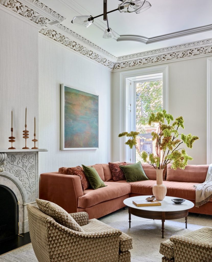 Luxe yet spirited, this classy living room honors vintage splendor with a pop of modern vitality. Its rust velvet sofa injects earth-tone coziness, countered with moss-green pillows and delicate wall moldings. Its marble fireplace and swoop-shaped chandelier echo classic, classy interiors yet somehow feel incredibly now. It’s a marvelous example of just how a large room needn’t feel large at all, demonstrating that grandeur may coexist with coziness when texture, hue, and heritage converge.