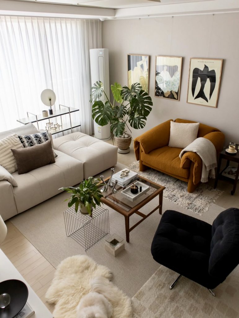 A masterclass in layering, this midcentury modern layout blends a colorful palette with sleek geometry. The burnt-orange chair pops against the grey rug and white sectional, while a black and brown accent chair adds contrast. The combination of farmhouse-style coziness and urban modern lines makes this space versatile for both large homes and small spaces. The vibe is easygoing yet curated—inviting you to sink in, unwind, and savor the balance of comfort and chic sophistication.