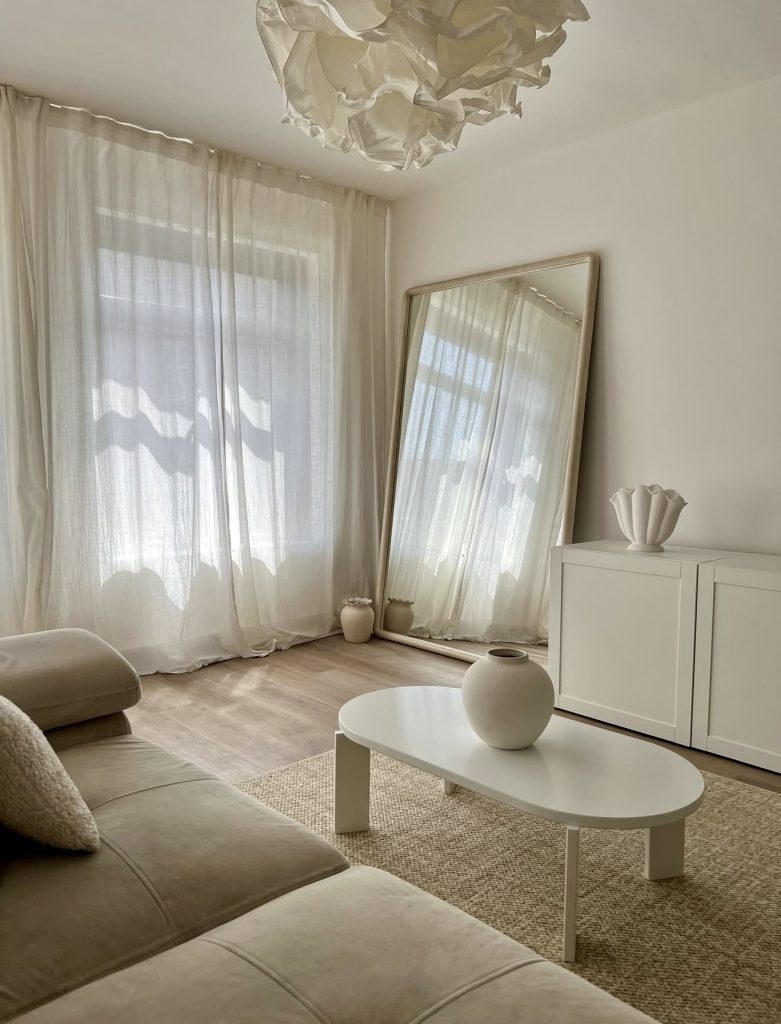 This serene space embodies Zen minimalism, where every element feels intentional and light. Layers of sheer drapery diffuse natural light across a monochrome palette of neutral whites and creams. A sculptural pendant and large mirror add modern artistry, balancing simplicity with softness. Ideal for small spaces, this design evokes calm and focus—a pure modern retreat that feels like a quiet morning meditation. Pair it with a grey throw or pale earth-tone rug to enhance its tranquil flow.