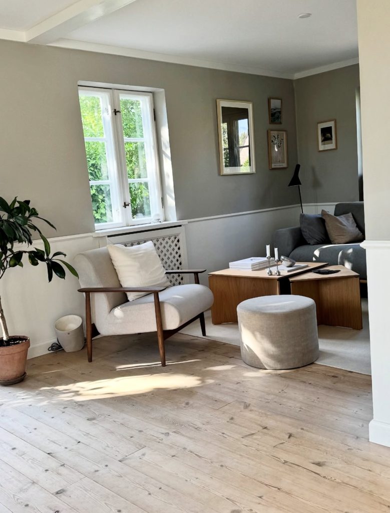 Timeless as well as earthy, this room embodies the spirit of midcentury modern living—clean shapes, natural wood, as well as velvety upholstery. The grey sofas as well as the armchair contribute a lazy, lived-in look, with light oak flooring as well as framed pieces of art bringing warm coziness. It’s a contemporary reinterpretation of understated luxury, ideal for small homes or open-plan apartments. The balance of structure and comfort makes this arrangement as useful as it is fashionable—a testament to how simple sophistication can still look ultra-elegant and classy.