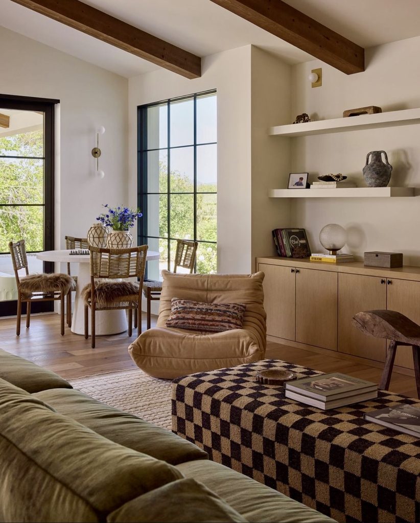 This room goes for a form of midcentury modern design, with clean-lined shapes and warm wood tones, as well as geometric patterns. An oversized checkered ottoman forms a dramatic statement piece, coming together in black as well as brown in a manner that feels stylish yet attainable. Natural light bolsters the room’s warmth, making it an inviting venue for get-togethers. A low lounge chair and woven fabrics invoke a delicate boho tone. The combination of vintage period pieces and contemporary components allows this living room to easily work with both apartments as well as larger homes.