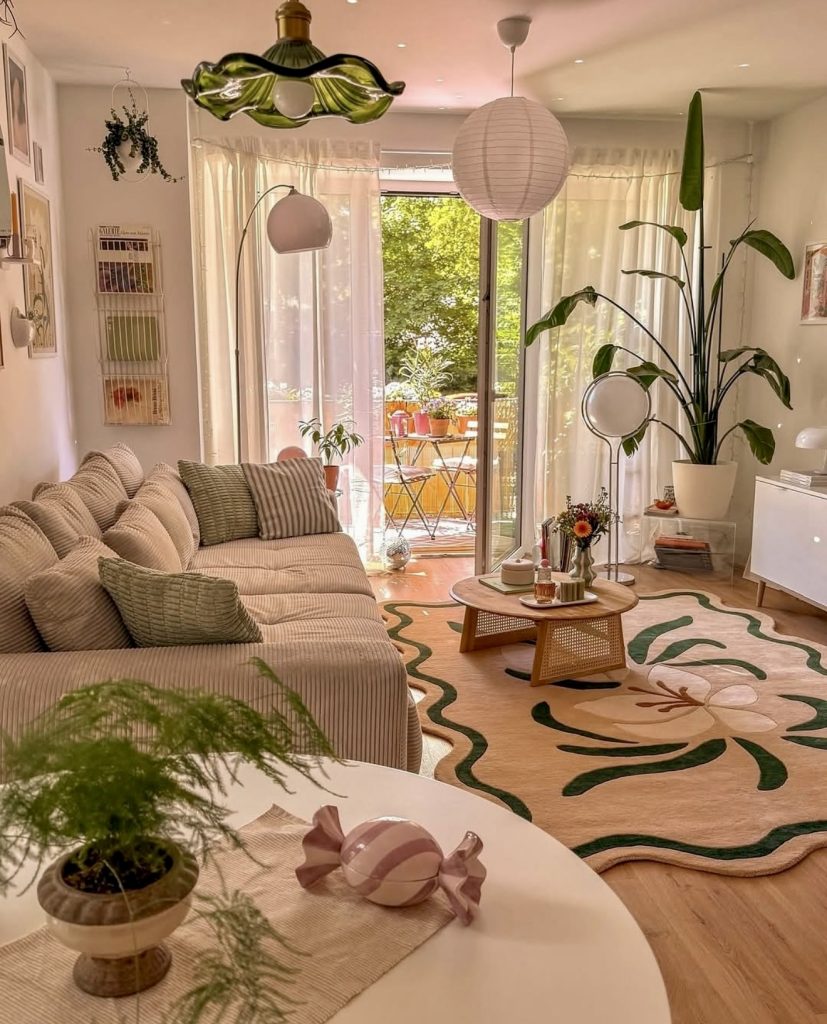 A colorful fusion of boho as well as vintage flair, this zestful apartment shines with character. Floral-shaped rugs as well as mismatched decor inject room-brightening hues, with natural light pouring in beneath billowy curtains. Many different textures as well as playful shapes create a room that’s both cozy and kinetic, best suited to young creatives who need a modern but personal look. Green accents as well as whimsical decor hint at a rustic modern minimalist spirit while maintaining a fresh, inviting, and uniquely 2026 feel.