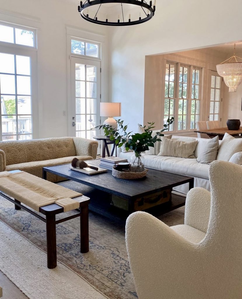This look honors elegant, classy comfort, with boucle seating, a coffee table in dark wood, and oversize windows pouring light into the room. The neutral color scheme feels classic, demonstrating that simple still packs a punch as a style statement. Natural warmth comes with a woven bench and plants on the table, which mellow out the clean layout. This combination of rustic textures with sophisticated furniture is a classic farmhouse-style modern concept. No matter if it’s a large family home or decorating tiny spaces, a combination of vintage pieces with contemporary elements produces balance.
