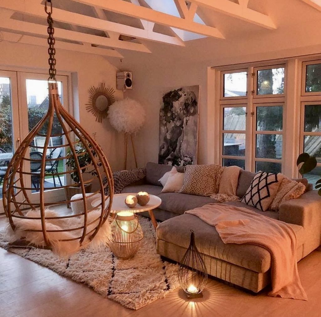 This room channels a boho ambiance with warm lighting, texturally layered elements, and a fun hanging chair. The sectional sofa serves double duty as a dark grey couch, tempered with texturally intriguing pillows and throws that create instant coziness. Light plays a big role here—lanterns and dim bulbs turn the room into a cocoon of warmth, best suited for evening or Christmas time. This combination of patterns and textures demonstrates that colorful needn’t necessarily mean bright but rather earthy and texturally layered. This aesthetic combines a relaxed, feminine apartment style with rustic modern minimalism.