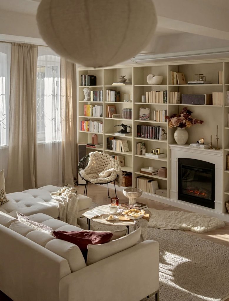 This living room appears like a haven for readers, with a built-in library wall as well as a lit fireplace that establishes a vintage earth-tone ambiance. A tufted sofa with texturally layered throws creates coziness, making this a great place for afternoons spent curled up with a book. Light filters softly through curtains, enhancing a neutral color palette as well as producing a peaceful yet inviting room. A combination of decorative items as well as beloved books infuses a room with rustic modern minimalist charm. This look works perfectly for apartments where every nook counts, bringing a combination of warm ambiance with practical design.