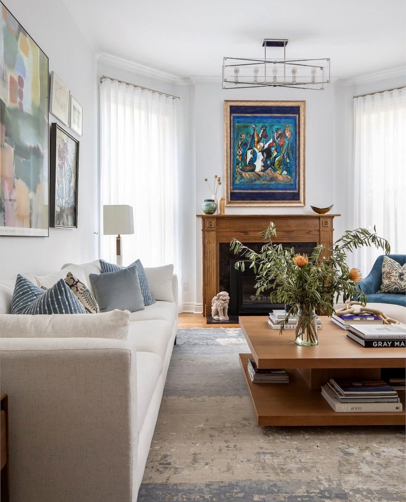 This living room pairs classy, elegant furniture with bold, artistic, colorful artwork for a sophisticated as well as lively look. White sofa furniture serves as an anchor, while a wood coffee table adds a warm, structural presence. Throw pillows with blue hues add a softness that pairs with the work of art but avoids dominating it. With a classic fireplace that pairs a modern look for a piece above, this contrasts classic vintage charm with a fresh, new-age look. It’s a wonderful combination for large homes where high-end living meets day-after-day living.