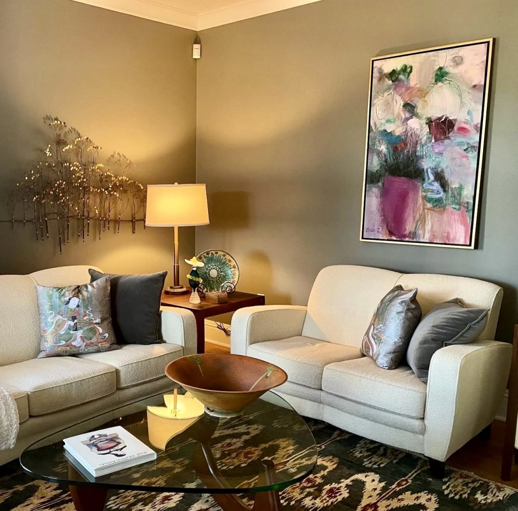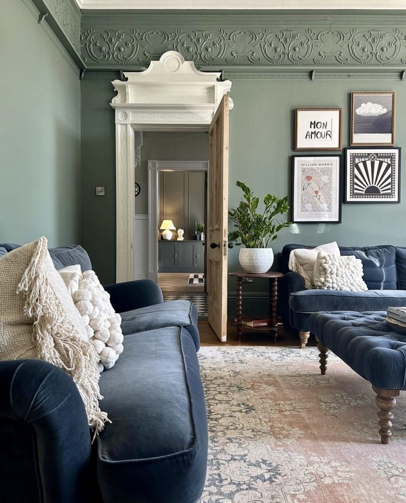 For homeowners who want both elegance and warmth, muted green is an excellent choice. Paired with ornate trims and deep navy seating, this palette leans into moody sophistication while remaining cozy. It’s a great example of ideas with brown furniture alternatives, where color becomes the unifying feature of the room. This shade feels heritage-inspired yet fresh, placing it among the best living room paint colors 2026. It’s especially effective in rooms with detailed molding or period architecture, proving that paint alone can tie together diverse design elements.