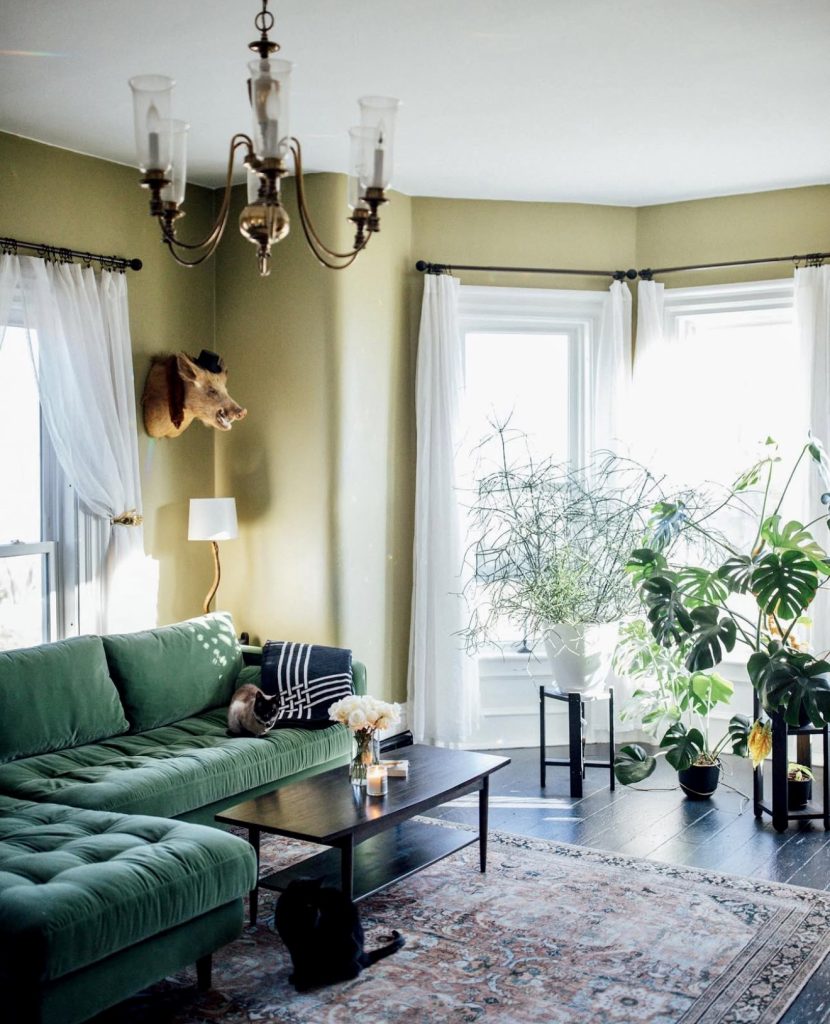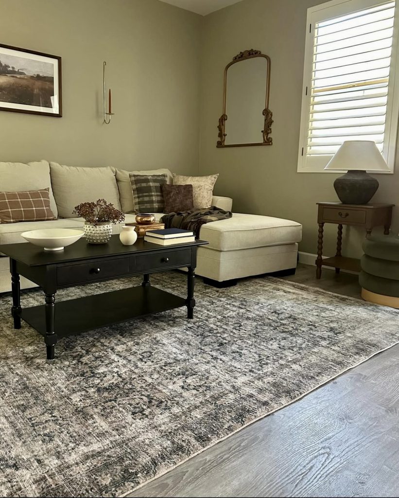 Olive wall paint creates an earthy backdrop that looks striking with a dark green sofa and layers of natural light. This example of living room paint colors 2026 shows how muted hues can still feel vibrant when paired with plants and patterned rugs. It’s ideal for homeowners seeking ideas with brown furniture alternatives that remain grounded in nature-inspired palettes. The color leans into cozy and moody territory depending on the time of day, making it one of the most flexible ideas 2026 for both traditional and modern homes.