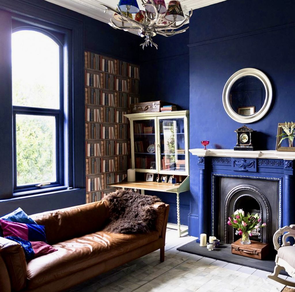 Deep navy makes a powerful statement, and it’s one of the most stylish living room paint colors 2026. This room pairs the richness of blue with traditional details like a carved fireplace and vintage décor, showing how ideas with accent wall can blend old-world charm with modern sensibility. The color’s depth gives the space a moody elegance, while leather seating warms it up. This is a strong contender for homeowners looking at ideas sherwin or ideas behr palettes with character, especially when paired with warm wood or ideas with brown furniture.