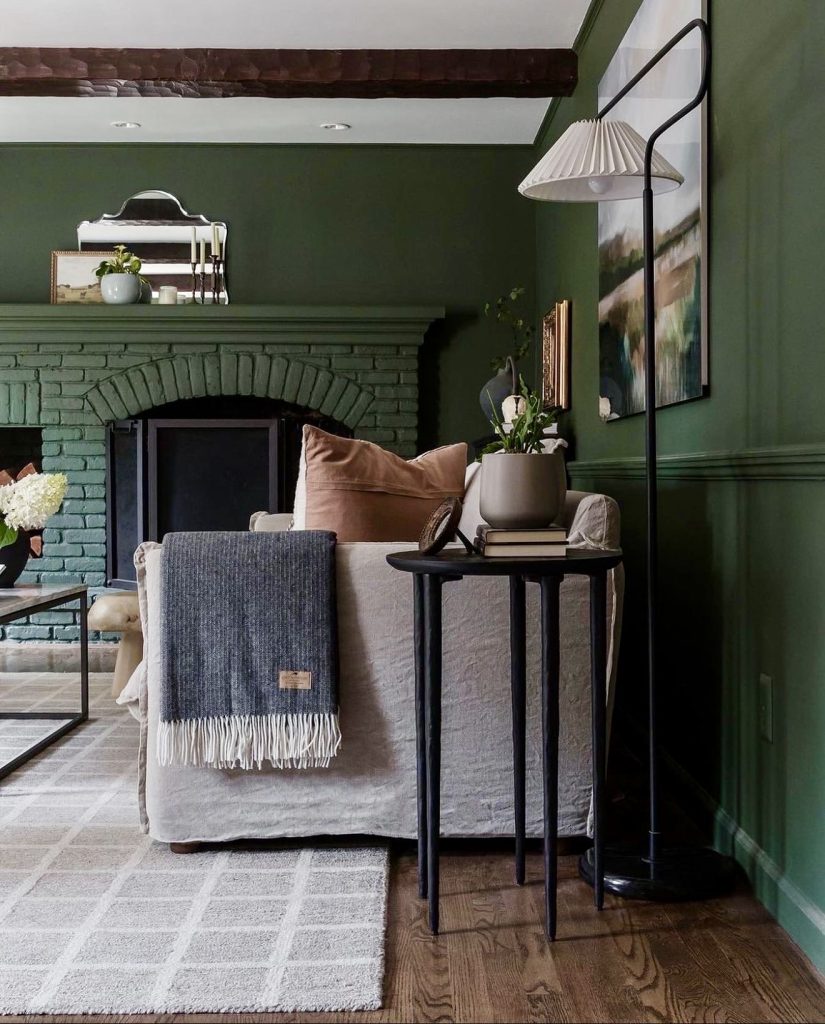 This deep forest green shows how living room paint colors sherwin william continue to embrace nature-inspired palettes. Combined with an ideas with red brick fireplace painted in the same tone, the look feels cohesive, dramatic, and cozy. It’s ideal for homeowners looking for ideas indian or heritage-inspired styles, where darker colors set an intimate tone. Paired with warm textiles and dark beams, this design proves that ideas dark wood floor and rich wall colors can create a timeless, enveloping atmosphere.