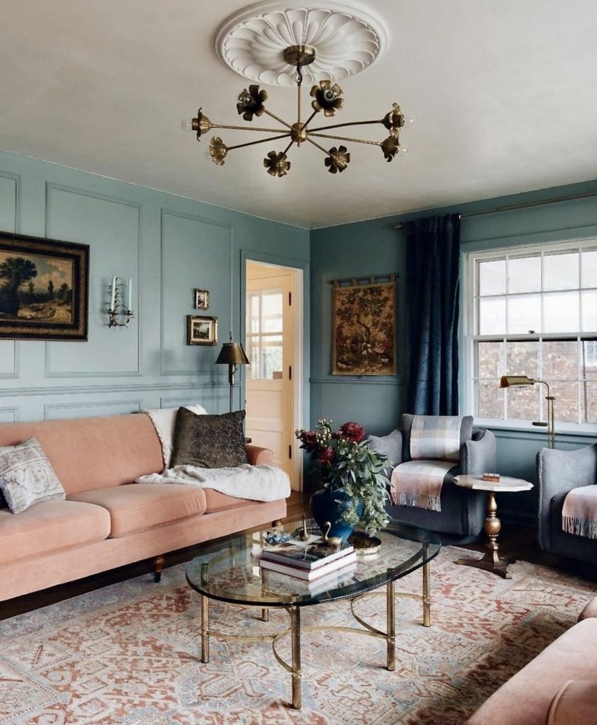 This powder blue wall color feels both fresh and timeless, pairing perfectly with blush seating and brass accents. It’s a stunning option for living room paint colors 2026, showing how softer tones can still create depth. The mix of antique art and modern furniture highlights how versatile this shade is—it works with ideas with brown furniture as well as metallics. For those who want ideas with accent wall light blue, this palette proves that pastel-inspired shades can be elevated when paired with luxe textures and layered patterns.