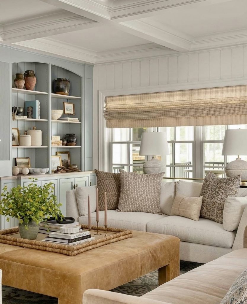 This combination of clean white walls and soft blue trim demonstrates a fresh take on living room paint colors 2026. It’s ideal for ideas with accent wall light blue, showing how color can be introduced subtly through architectural details. The contrast with patterned textiles and natural wood floors creates a balanced, welcoming space. This approach is also flexible: it fits seamlessly into modern farmhouse interiors while also appealing to those looking for ideas indian asian paints bedroom influences. The result is a bright, airy design that still feels layered and thoughtful.