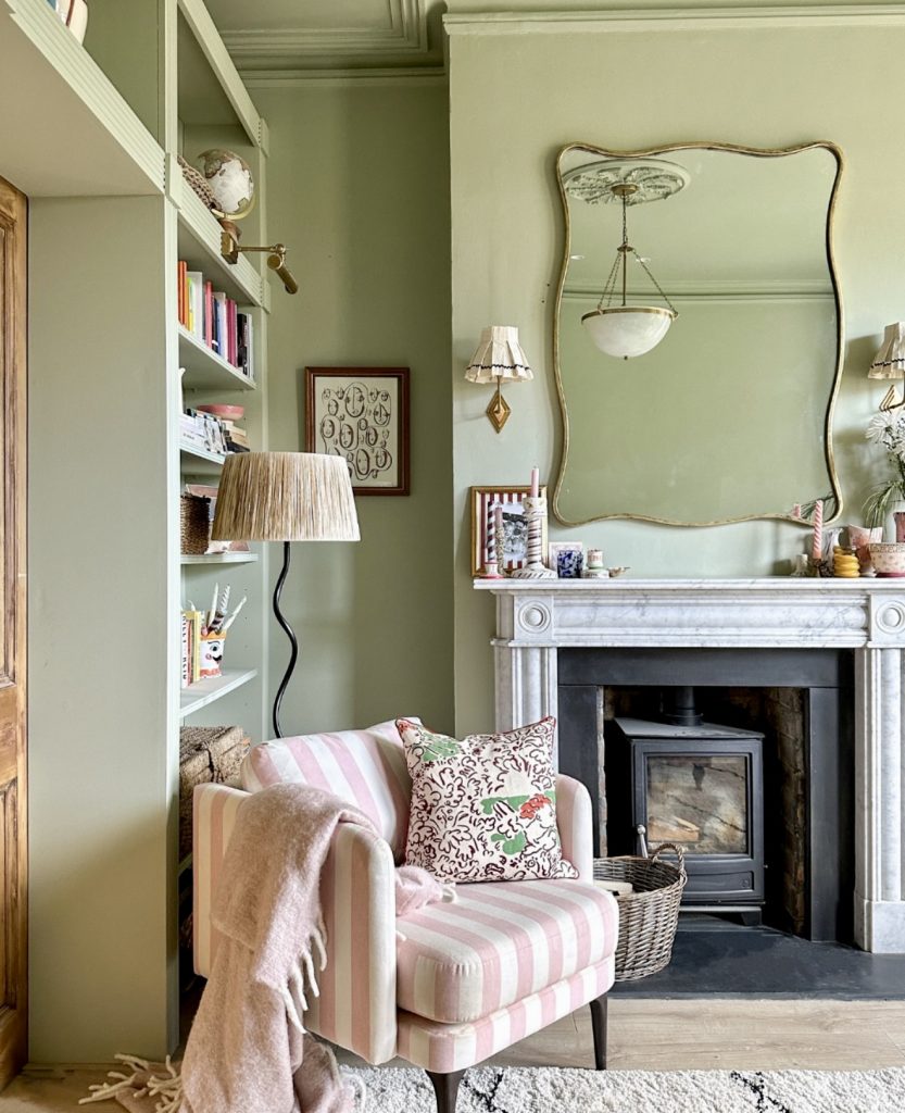 A muted green wall color sets a relaxed, heritage-inspired mood, especially when paired with a stone fireplace and vintage accents. This is an elegant take on living room paint colors 2026, offering ideas indian asian paints bedroom tones that translate beautifully into shared spaces. The result feels polished but approachable, and it’s a natural fit for homes with ideas with red brick fireplace or traditional woodwork. Styled with striped upholstery and floral pillows, the room has a balanced mix of charm and comfort—proof that ideas sherwin palettes can still feel personal.