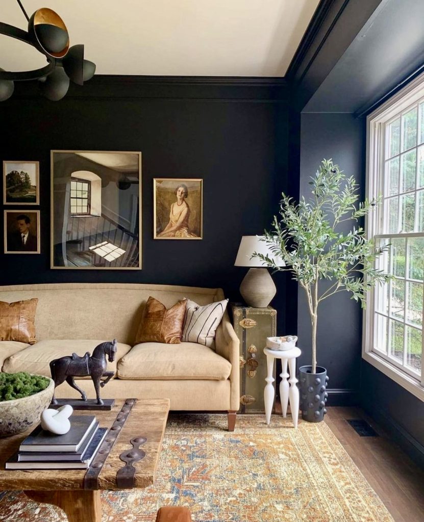 Few palettes carry as much drama as deep black walls. This design shows how ideas grey accent wall gray flooring can evolve into something bolder, with black offering both depth and sophistication. Paired with tan seating, rustic woods, and classic art, it highlights the rise of moody living room paint colors 2026. While not for everyone, black can be one of the best choices for homes that want strong personality. It works especially well in rooms with ample light and layered warm neutral furnishings that keep the space from feeling too stark.