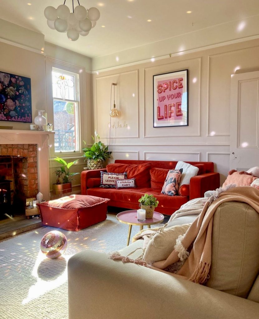 This room shows how warm neutral walls can set the stage for bold furniture choices. The beige backdrop allows the vibrant red sofa to shine, proving that ideas with accent wall don’t always need to rely on dark hues. Instead, the balance of light tones and bold accents creates a playful, cozy vibe. Perfect for those who love ideas sherwin or ideas behr palettes that remain versatile but not boring. Adding color through textiles and artwork lets you keep your paint palette simple while still enjoying personality-packed design.