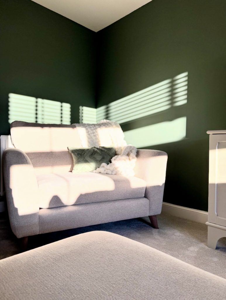 Rich forest green makes a bold statement here, showcasing how living room paint colors sherwin william and ideas behr are leaning toward darker, nature-inspired palettes. This look embodies ideas dark wood floor pairings, creating a striking yet inviting space. When styled with simple, plush seating, the dark backdrop transforms into a cozy retreat—proof that moody colors don’t need to feel intimidating. It’s one of the strongest ideas 2026 for homeowners who want a room with atmosphere and depth.