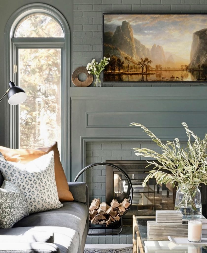 Shades of green continue to dominate the conversation around living room paint colors 2026, especially when combined with plenty of light. Here, the painted brick fireplace becomes a natural focal point, tying in with soft grey seating and warm accents. For those who love ideas with red brick fireplace, painting the brick in muted green or grey-green can give it a fresh, modern look without losing character. It’s also an excellent example of ideas grey accent wall gray couch, where the muted tone of the walls highlights rather than competes with the furnishings.