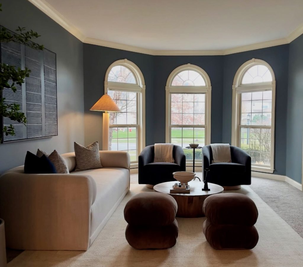 Blue remains one of the most versatile living room paint colors 2026, and this space shows why. The rich walls frame the tall arched windows beautifully, creating a moody yet serene effect. Balanced with cream upholstery and dark accent chairs, this palette works for both formal entertaining and everyday lounging. It’s a fantastic example of ideas grey accent wall gray couch alternatives, where blue steps in to provide depth without overwhelming the architecture. Pairing this shade with warm lighting and natural materials keeps the room feeling cozy and grounded.